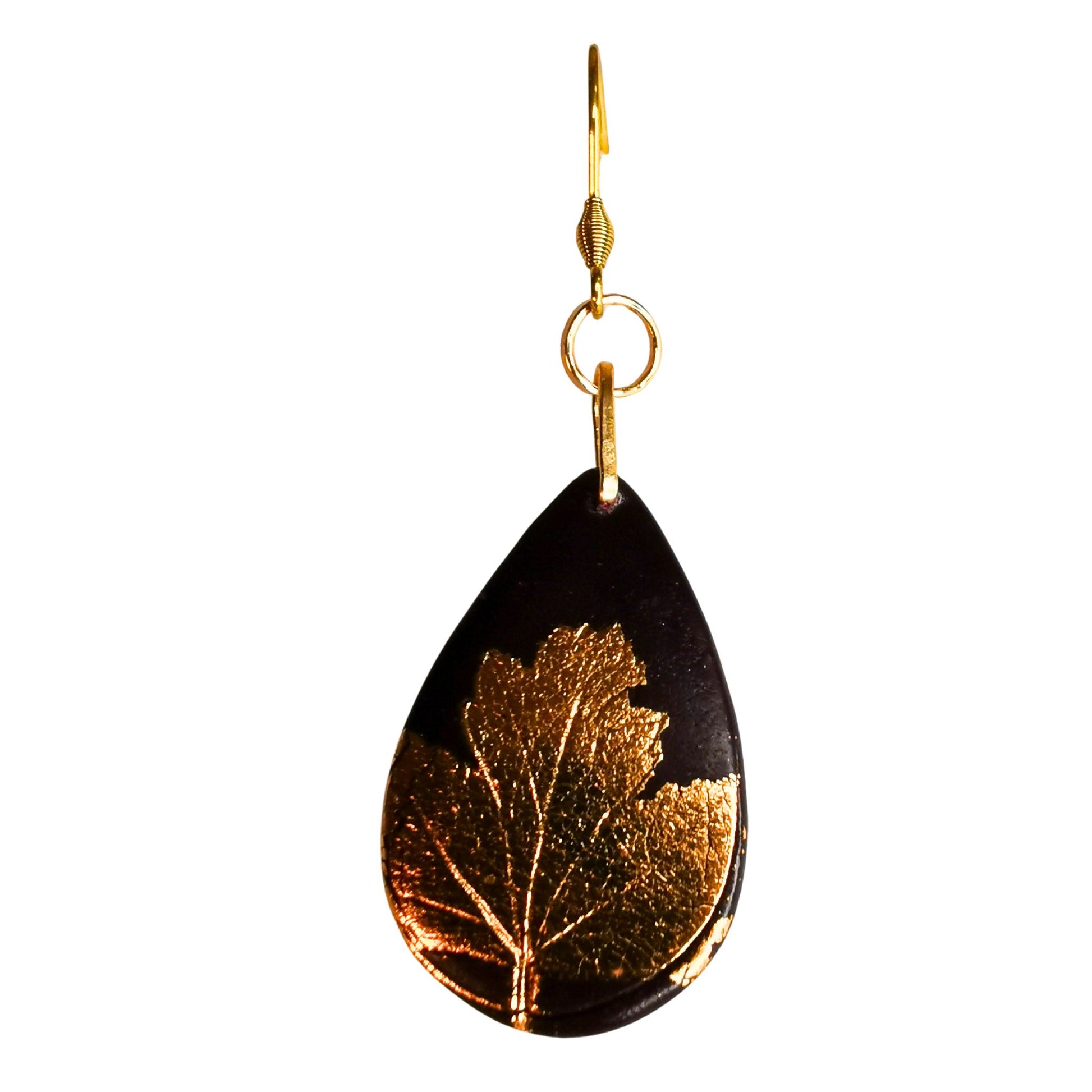 Hængeøreringe i bordeaux med gulddetaljer og bladtryk