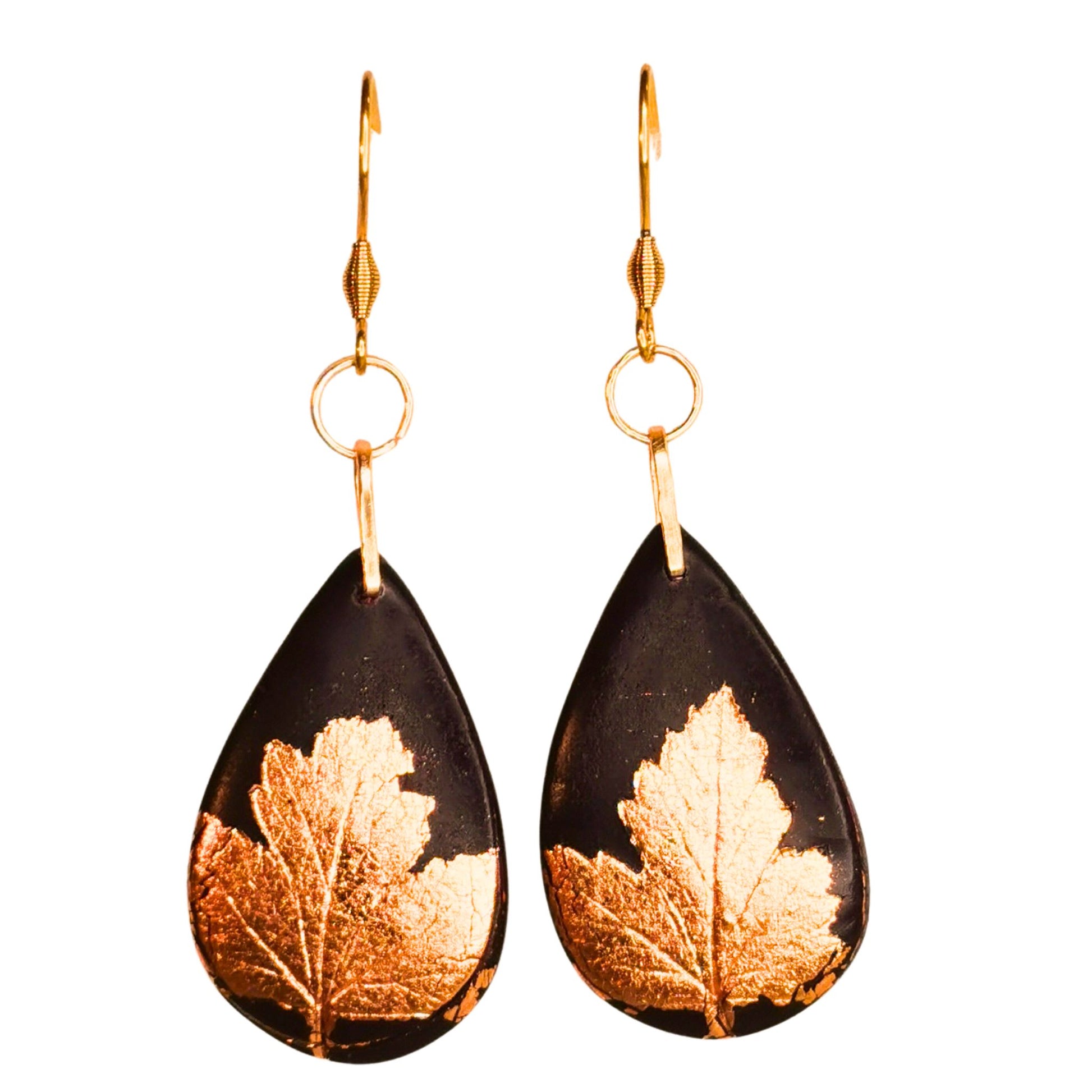 Disse elegante hængeøreringe kombinerer dyb bordeaux farve med smukke gulddetaljer og hamret messing. Aftrykket er lavet af et ægte geraniumblad, hvilket giver et unikt og naturinspireret design med masser af personlighed.