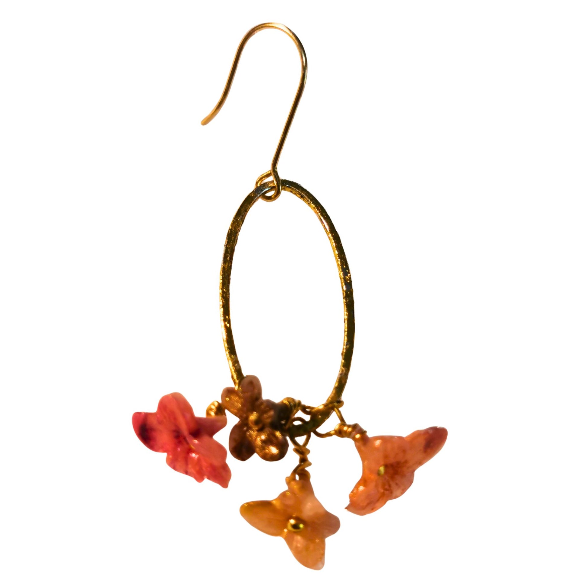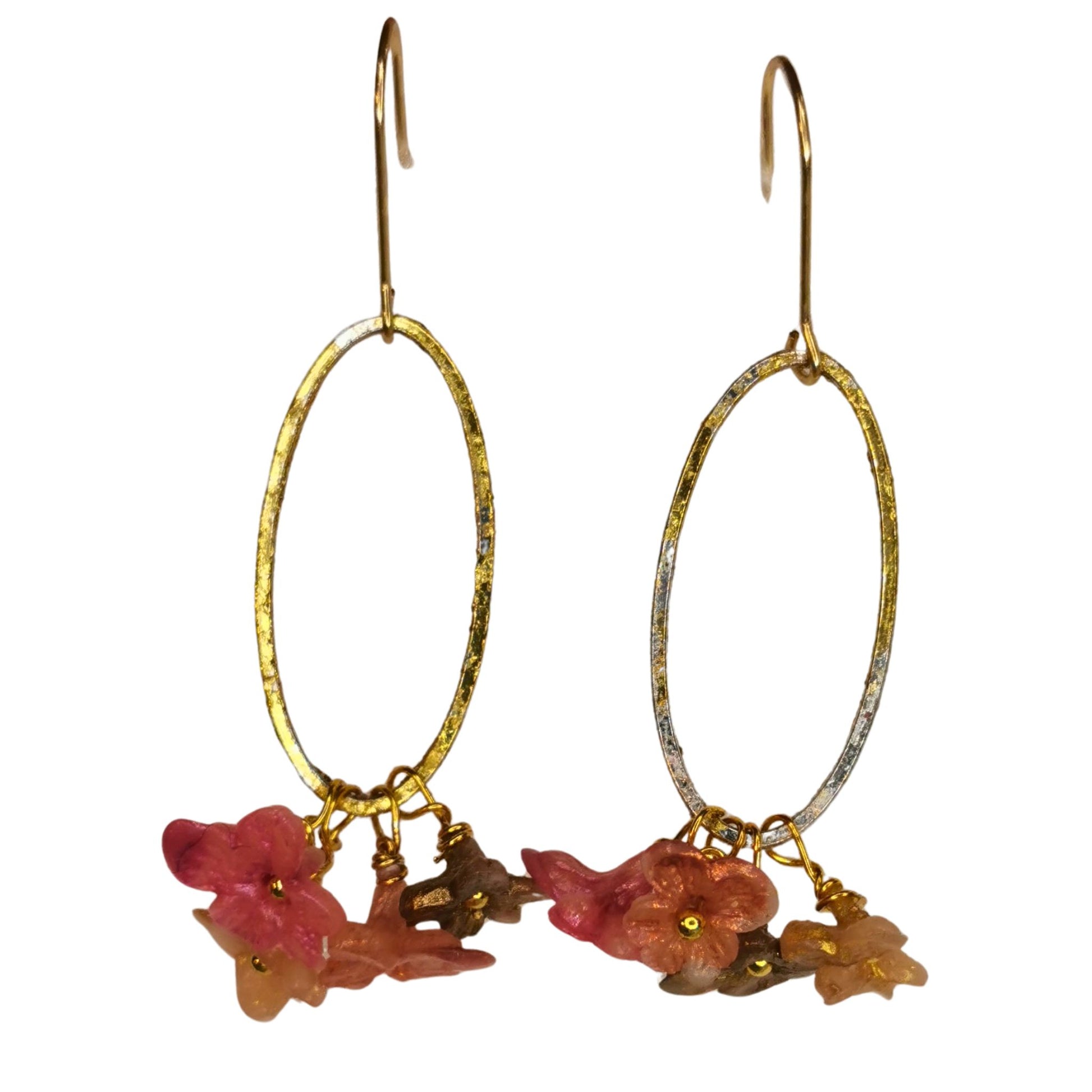 Disse feminine hængeøreringe kombinerer et charmerende cluster af blomster med en elegant oval ring i guldbelagt messing. Den ovale ring har en smuk, struktureret overflade, som giver et raffineret og eksklusivt udtryk.