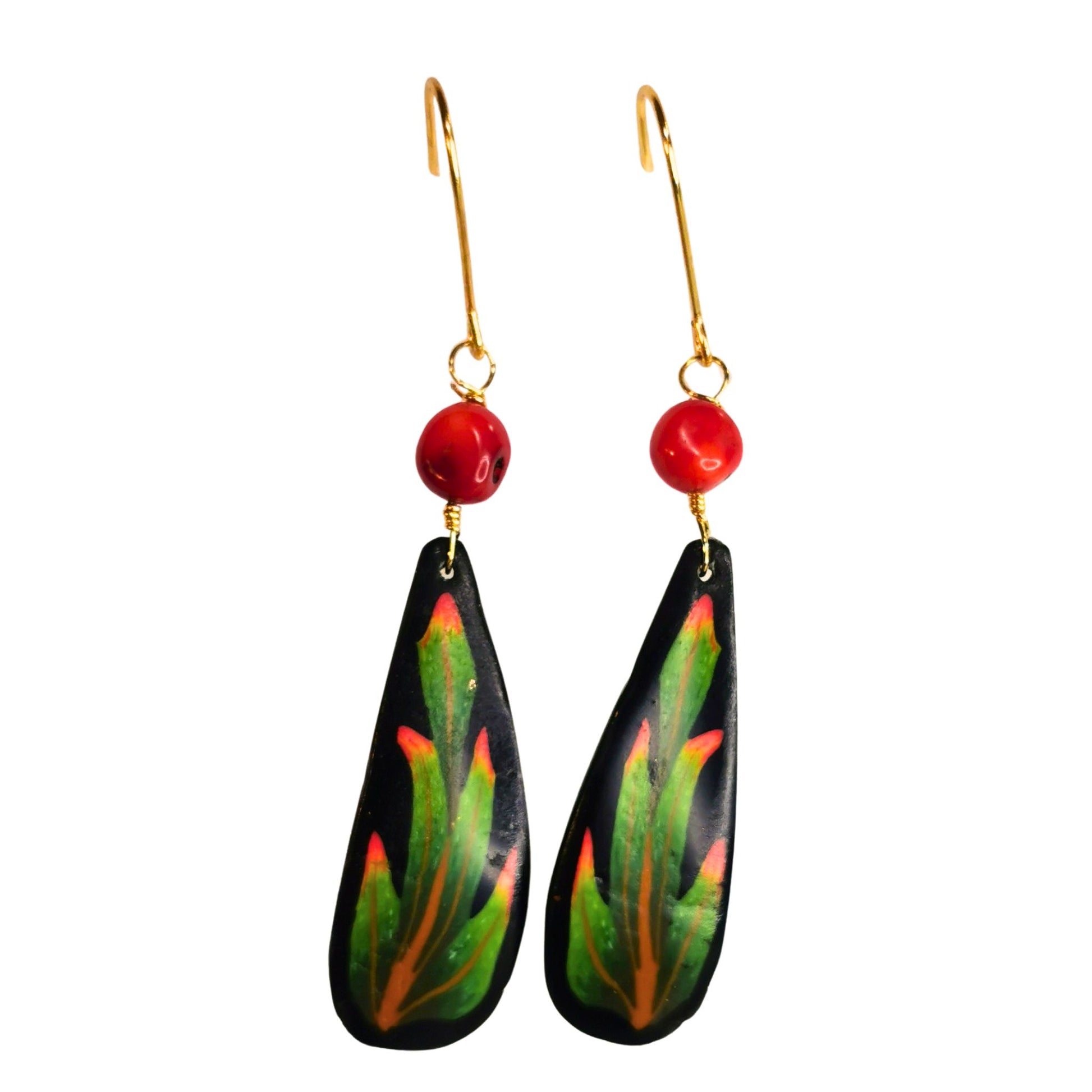 Disse håndlavede hængeøreringe kombinerer naturens skønhed med et strejf af luksus. De detaljerede, eksotiske blade giver et levende og organisk udtryk, mens de ægte koraler tilføjer varme farvetoner og et unikt præg.